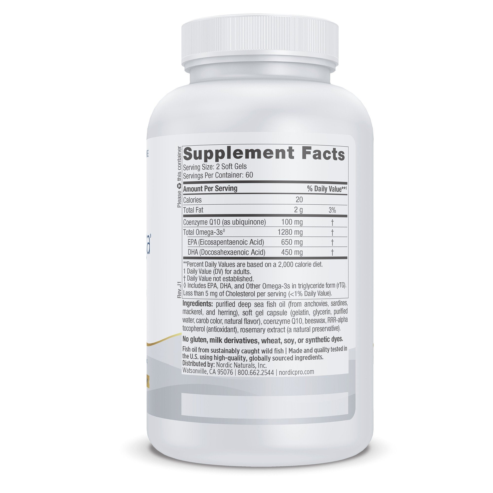 Other Ingredients: purified deep sea fish oil (from anchovies, sardines, mackerel, and herring), soft gel capsule (gelatin, glycerin, purified water, carob color, natural flavor), coenzyme Q10, beeswax, RRR-alpha tocopherol (antioxidant), rosemary extract (a natural preservative).