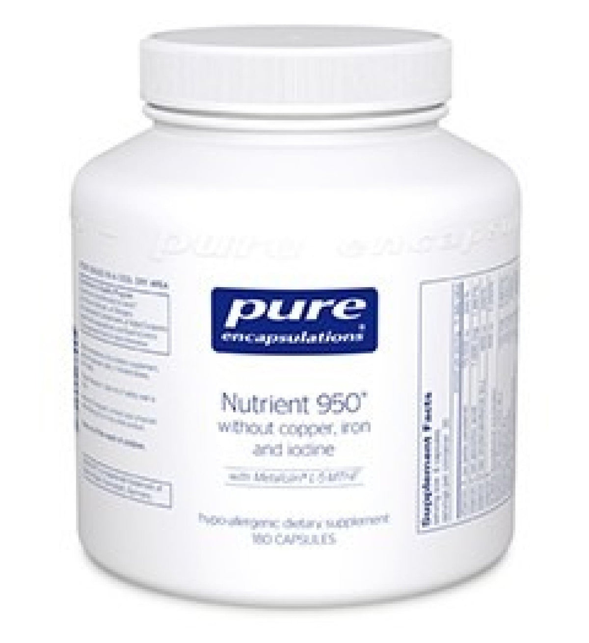 Nutrient 950 is a complete hypo-allergenic, high-nutrient, bioavailable multi-vitamin, multi-mineral and trace element supplement. It offers an advanced mineral delivery system, and the highly desirable coenzyme forms of B vitamins to promote optimal absorption of the nutrients. In addition, it provides a high profile of free radical scavenging antioxidants. This is a gentle, hypo-allergenic formula which is well tolerated by sensitive individuals. As part of a well-balanced diet that is low in saturated fat and cholesterol, folic acid, vitamin B6 and vitamin B12 may reduce the risk of vascular disease.