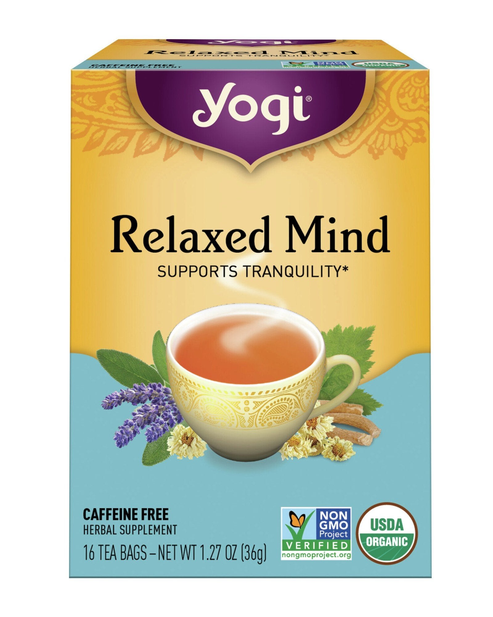 " Yogi Relaxed Mind tea is purposefully blended with Ashwagandha, this Ayurvedic adaptogenic herb has been used for centuries to promote balance and support the bodys ability to cope with stress. Deliciously floral Lavender and herbaceous Sage impart soothing floral notes to this earthy, herbal tea blend. Sit back and enjoy a cup of Yogi Relaxed Mind tea to bring yourself to a state of tranquility.*"